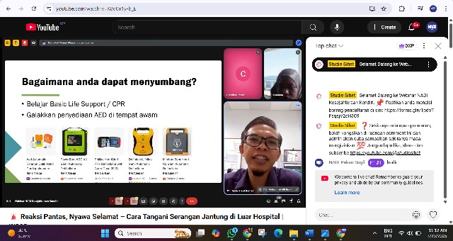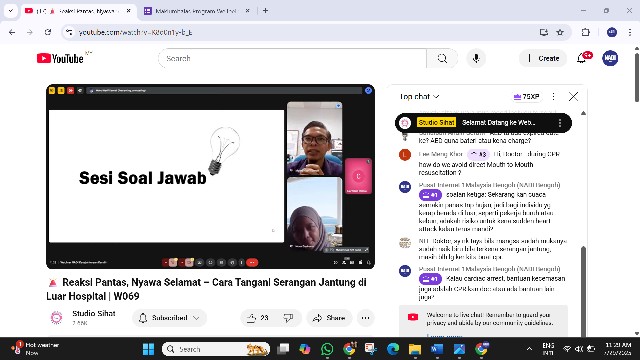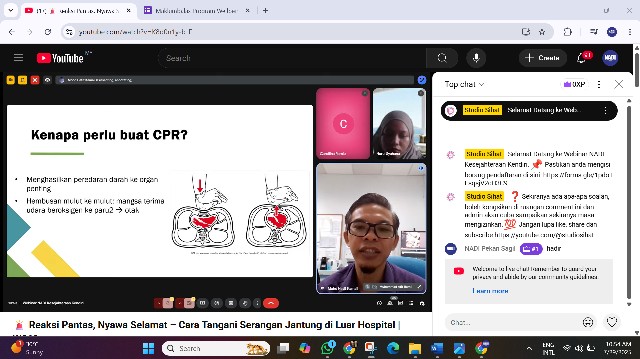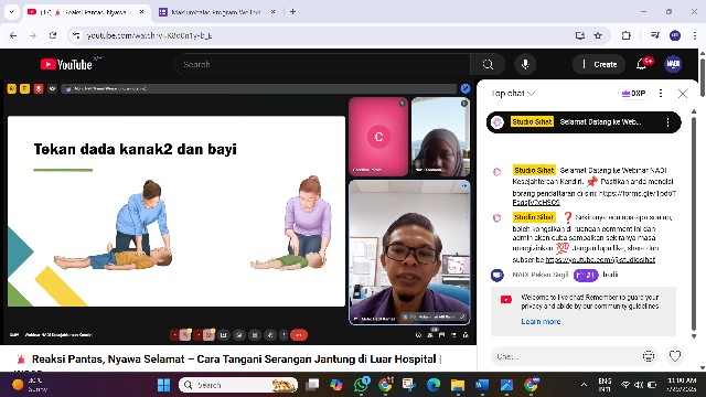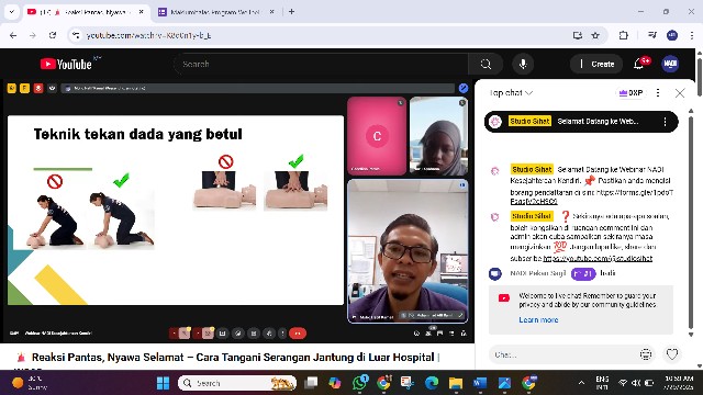 Webinar ini disediakan secara atas talian melalui google meet. Peserta juga boleh menonton secara live di Youtube live, saluran Studio Sihat dan Facebook live: NADI Malaysia. Melalui webinar ini, kita dapat pelajari cara untuk tangani serangan jantung melalui pertolongan kecemasan, CPR (Cardiopulmonary resuscitation).